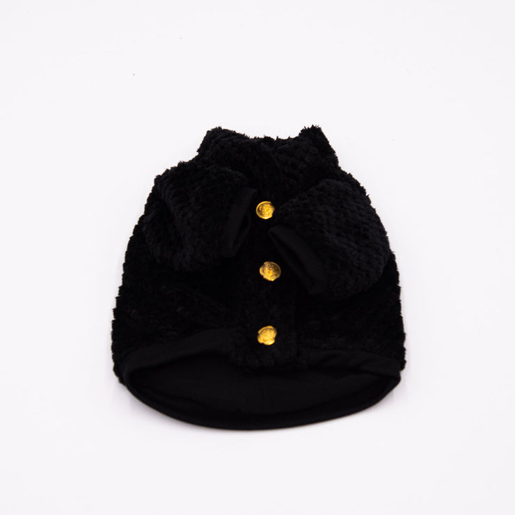 Made out of fuzzy fabric and stretch fabric lining for an ultra-soft feel, it's perfect for colder fall days or warmer winter walks! But one of my favorite parts is in the details, I love the cute golden buttons in the front for that elegant touch.